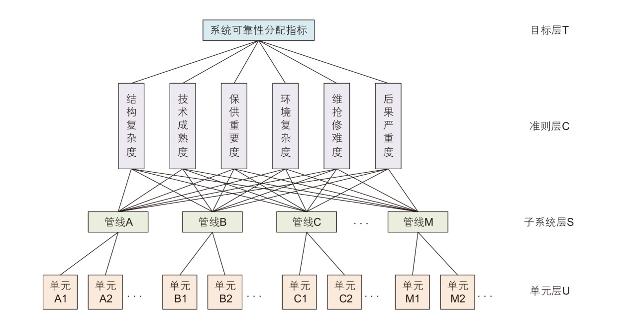 关键词: 天然气管网, 复杂拓扑结构, 可靠性分配, 递阶层次结构模型, 层次分析法, 供气可靠性
